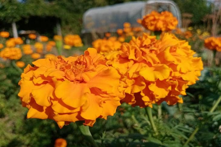 Sammet och ringblomma är inte bara ljuspunkter för skönhet, utan riktiga vakter med en skarp doft, som inte tolereras av nematoder, bladlöss och till och med Colorado-potatisbaggen. Deras rötter släpper ut speciella ämnen som renar jorden, medan de iögonfallande blomställningarna drar bort skadedjursfjärilar från din kål.